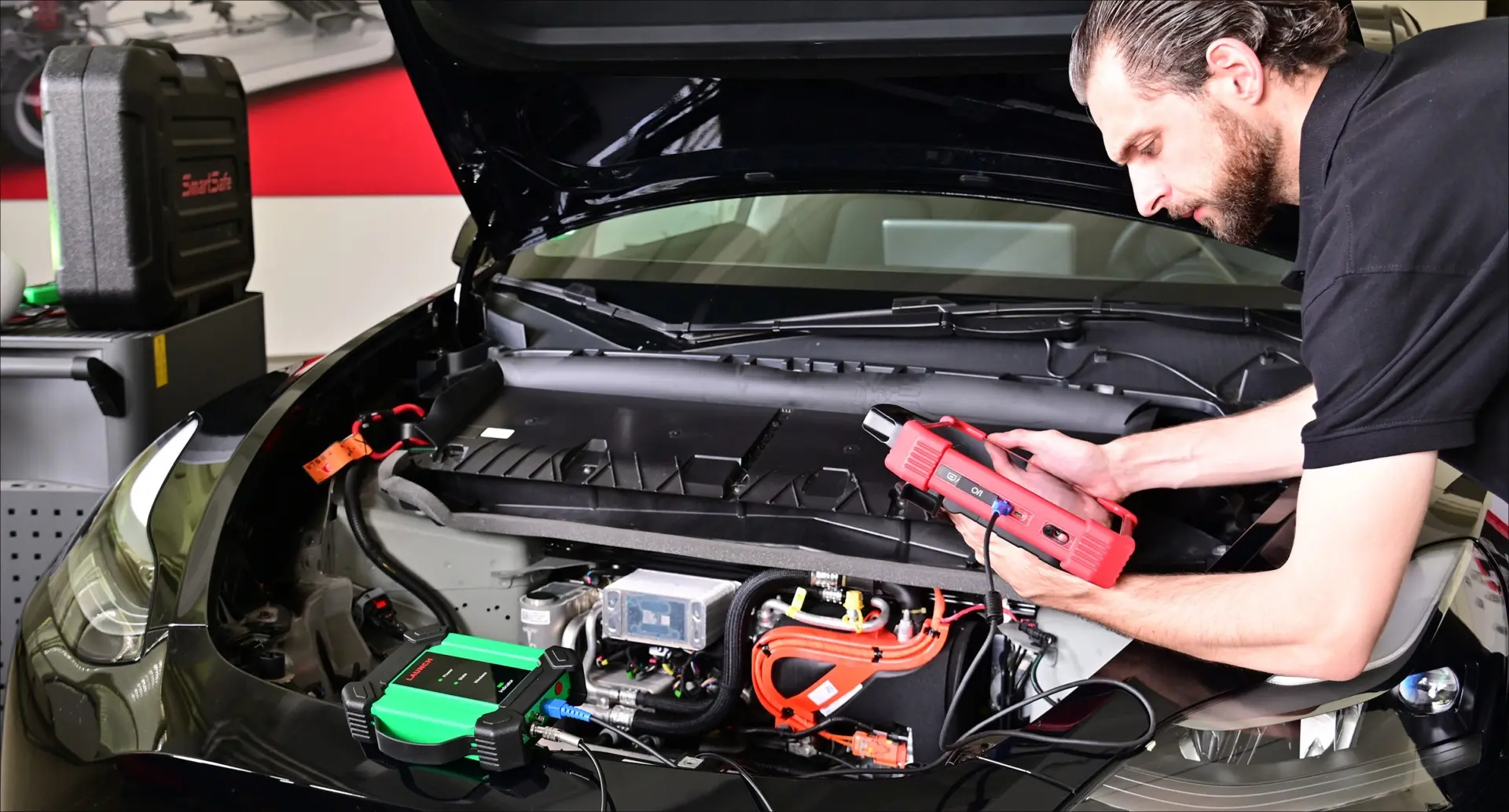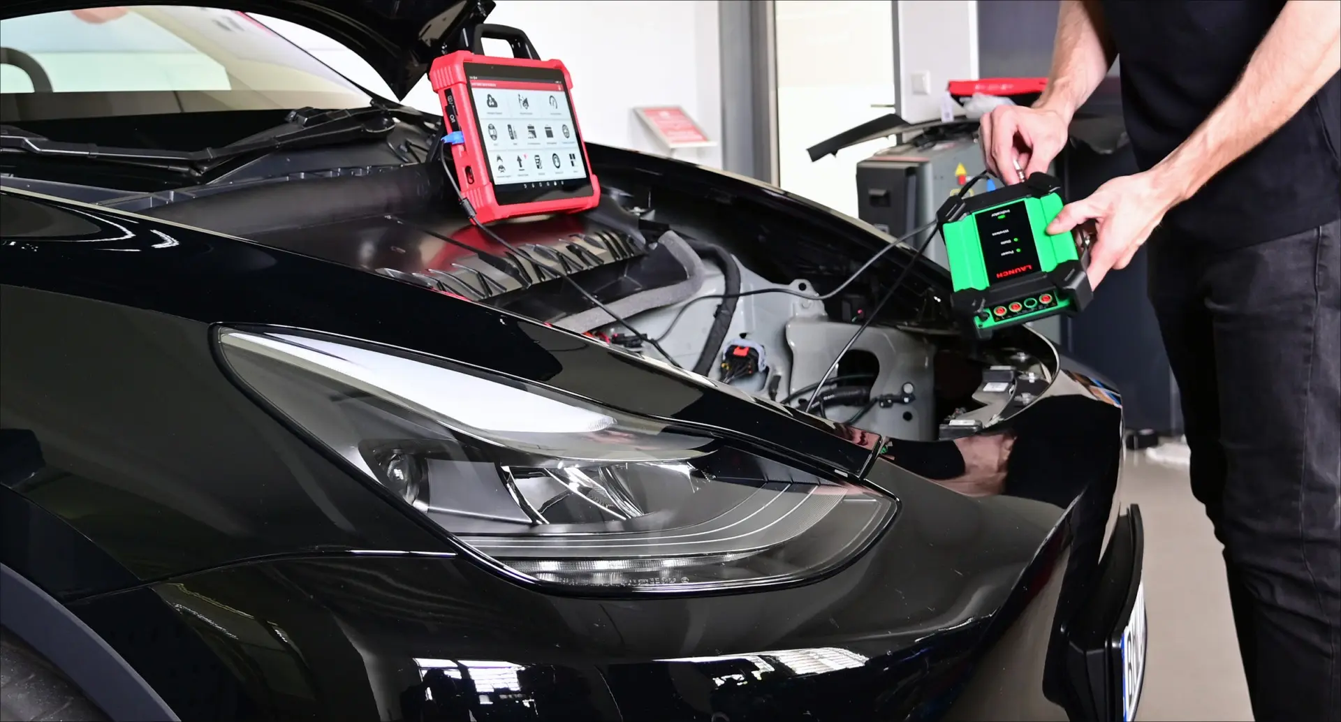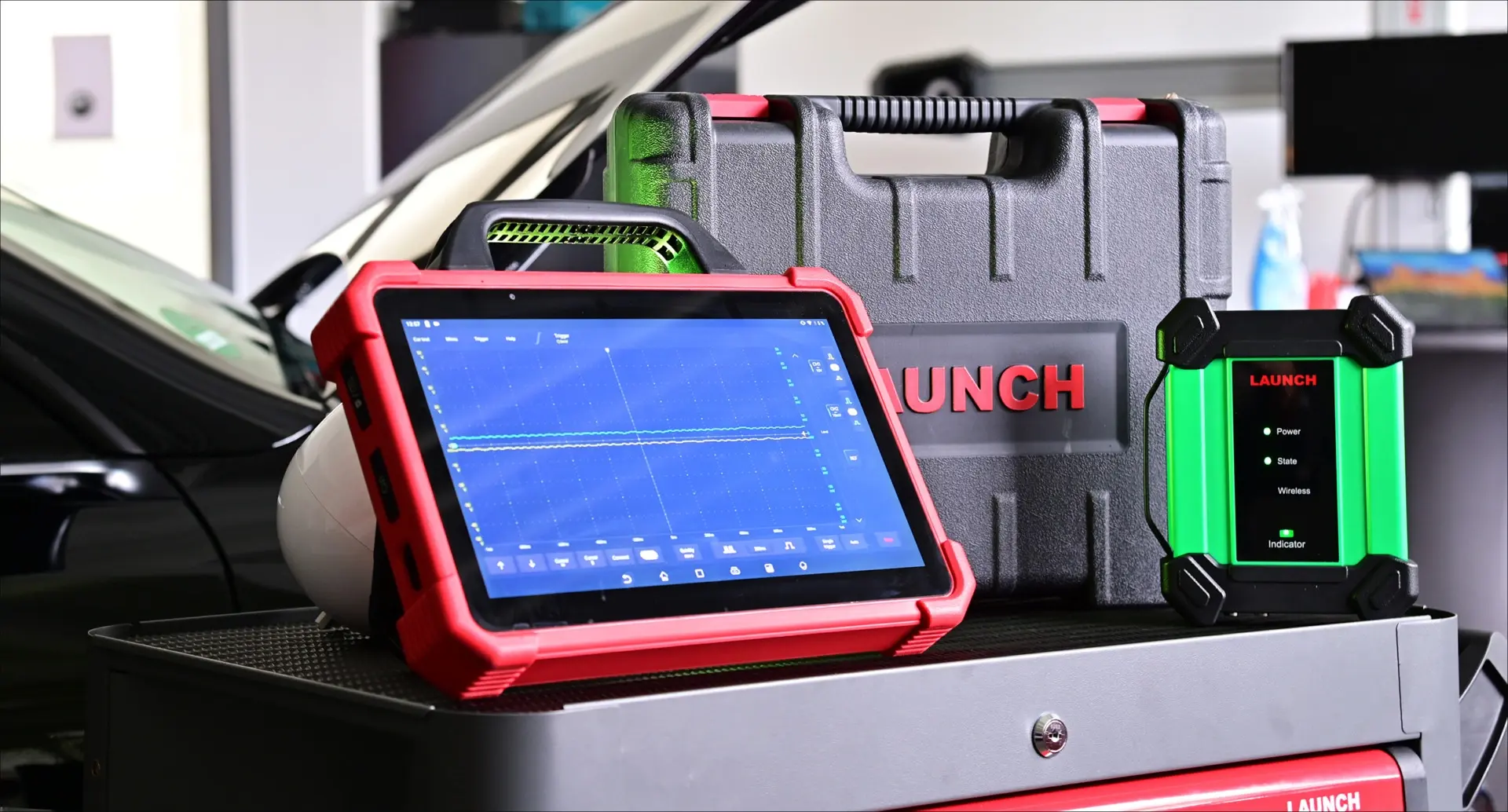 LAUNCH Europe’s EM101 is an innovative dual tool that combines the functionality of an oscilloscope and a multimeter in a single unit. Ideal for measuring current, voltage and resistance in vehicles with high-voltage batteries, it offers both wired and wireless communication options in conjunction with the X-431 EURO TAB 3. Its ease of use makes the EM101 the first choice for car repair shops and their professionals.